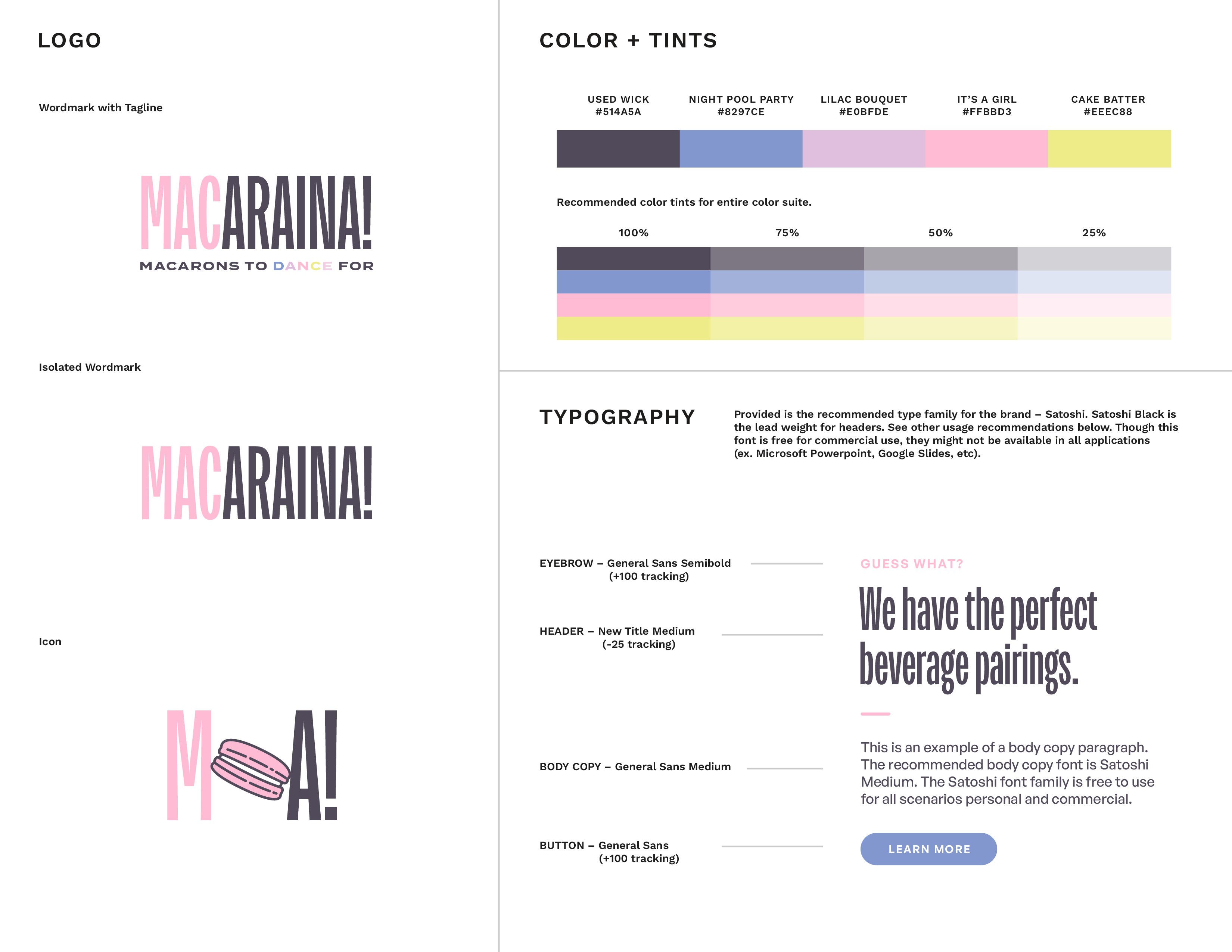Macaraina's visual system is designed to channel feelings of joy and celebration. Even the names of all the colors are celebration themed. This is felt especially relevant to the brand's identity because catering events is a large portion of its business model.