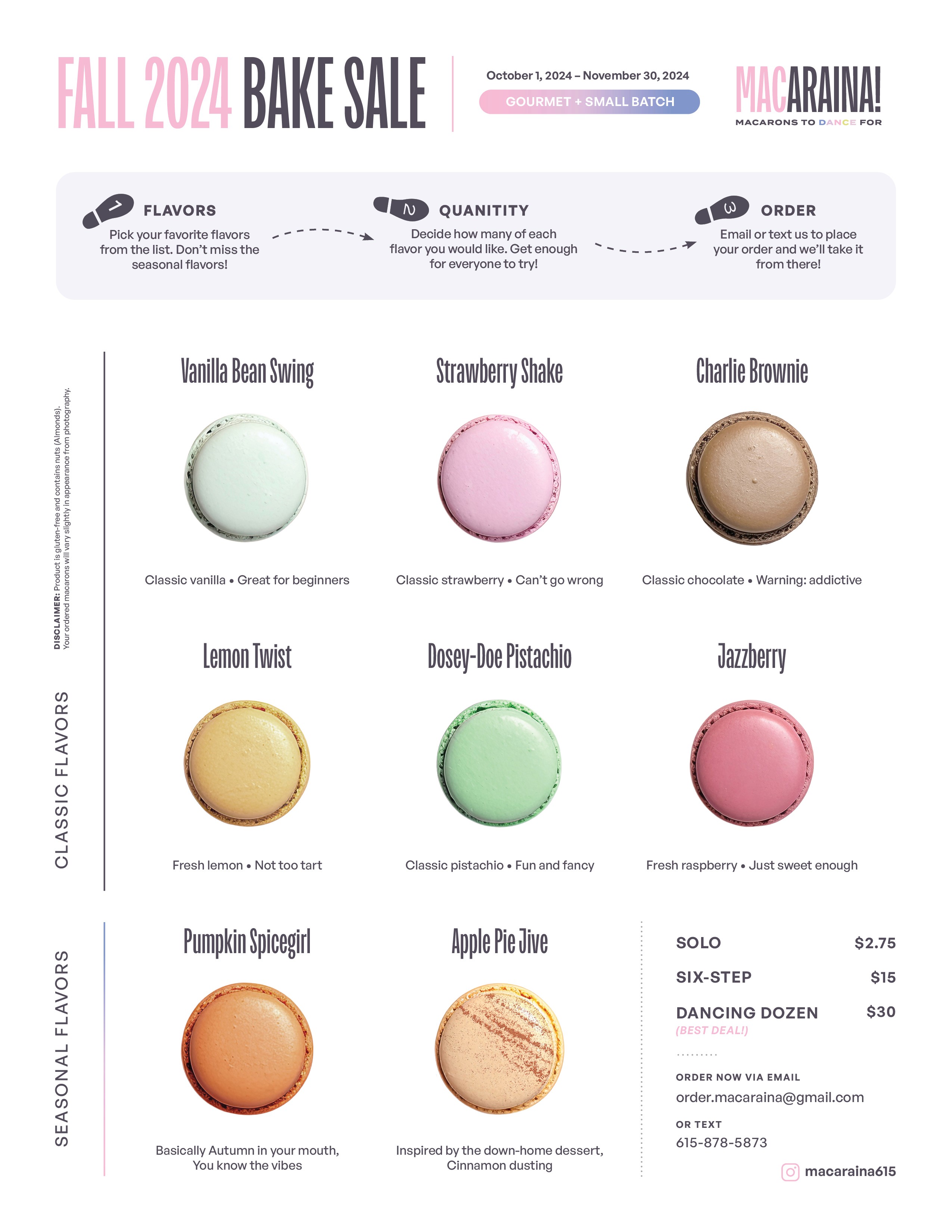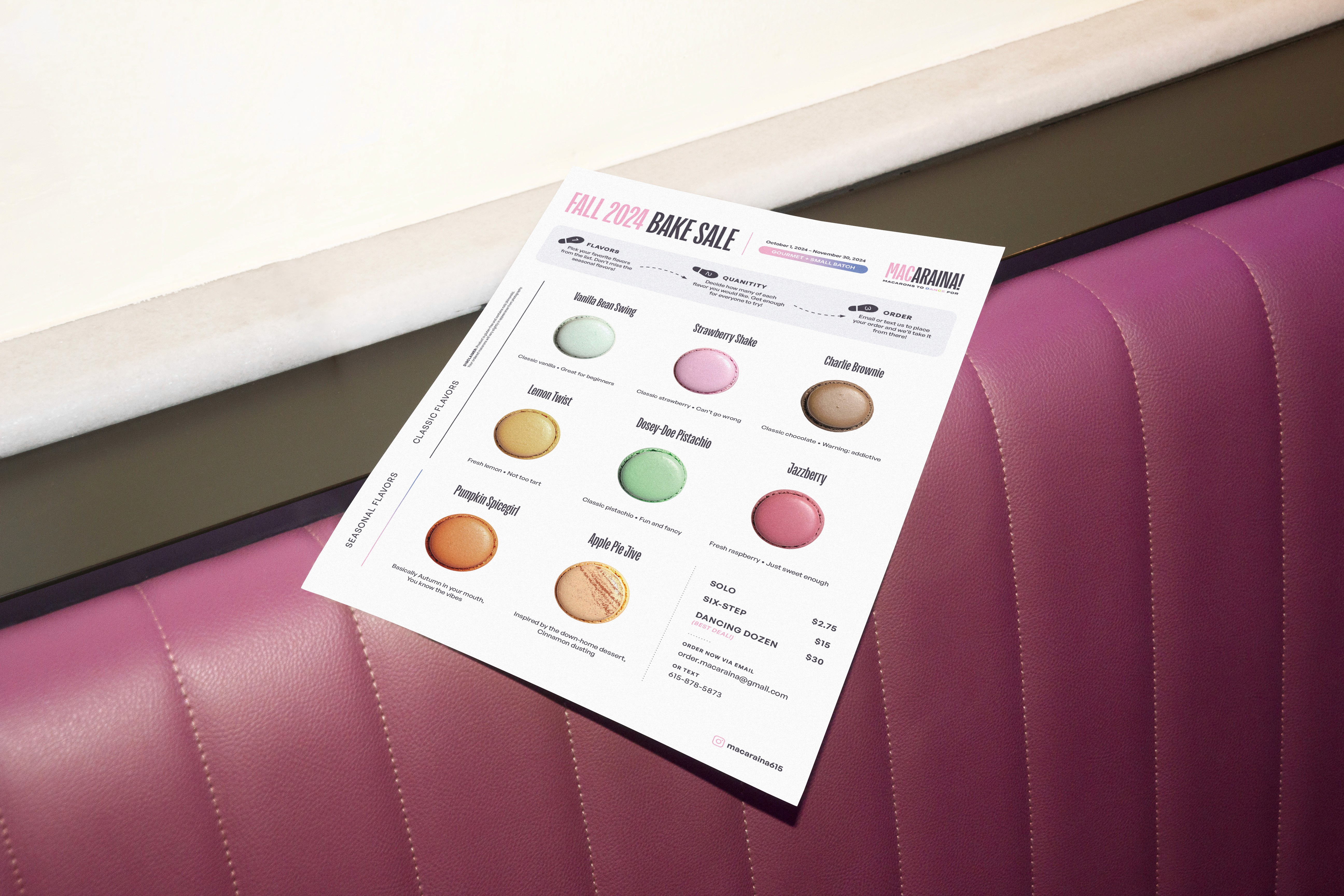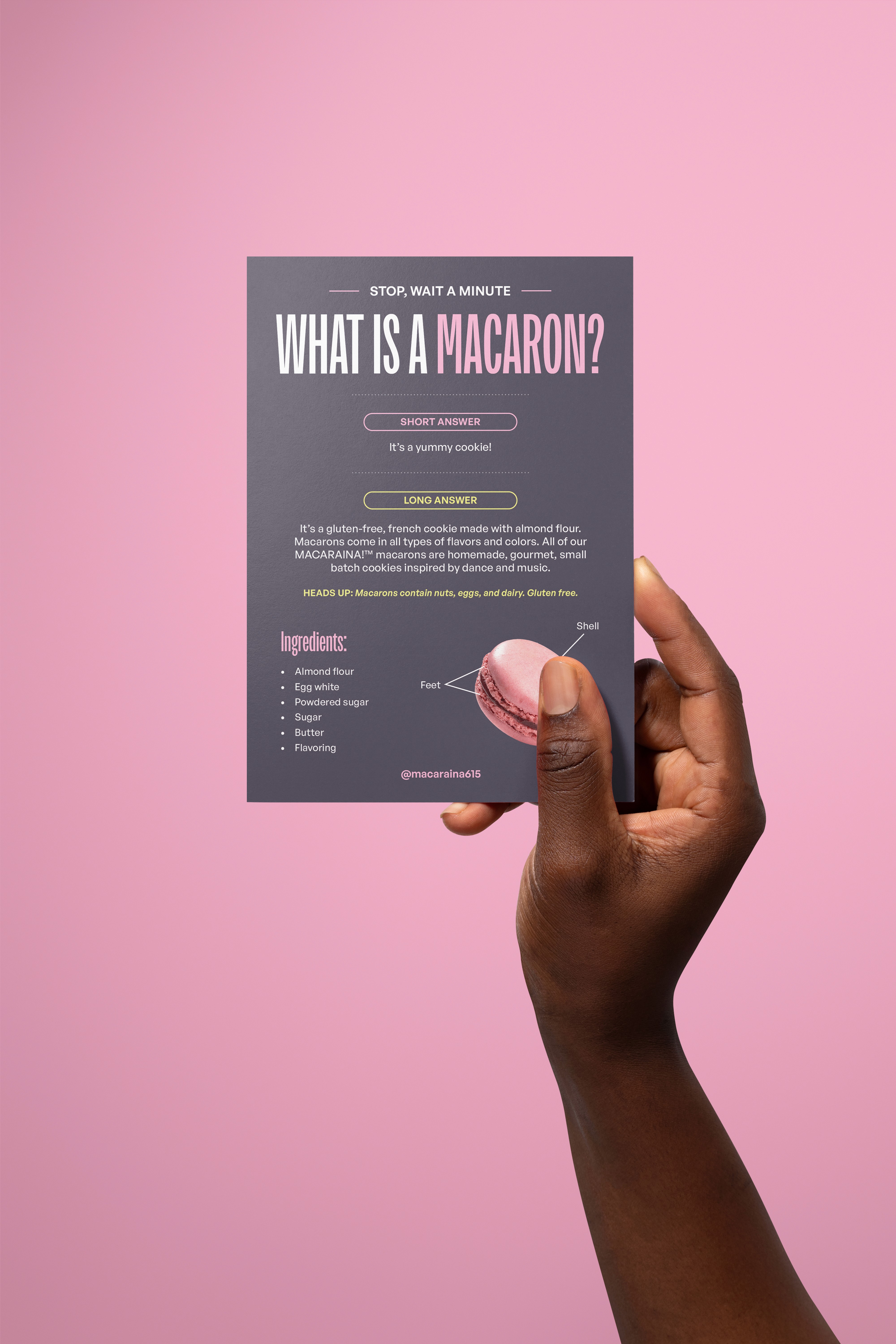 For Macaraina, flavor is king. This menu flyer and animated flavor cards help to celebrate the list of available cookies by putting them front and center. We created dance-themed flavor names to align with the brand's identity.